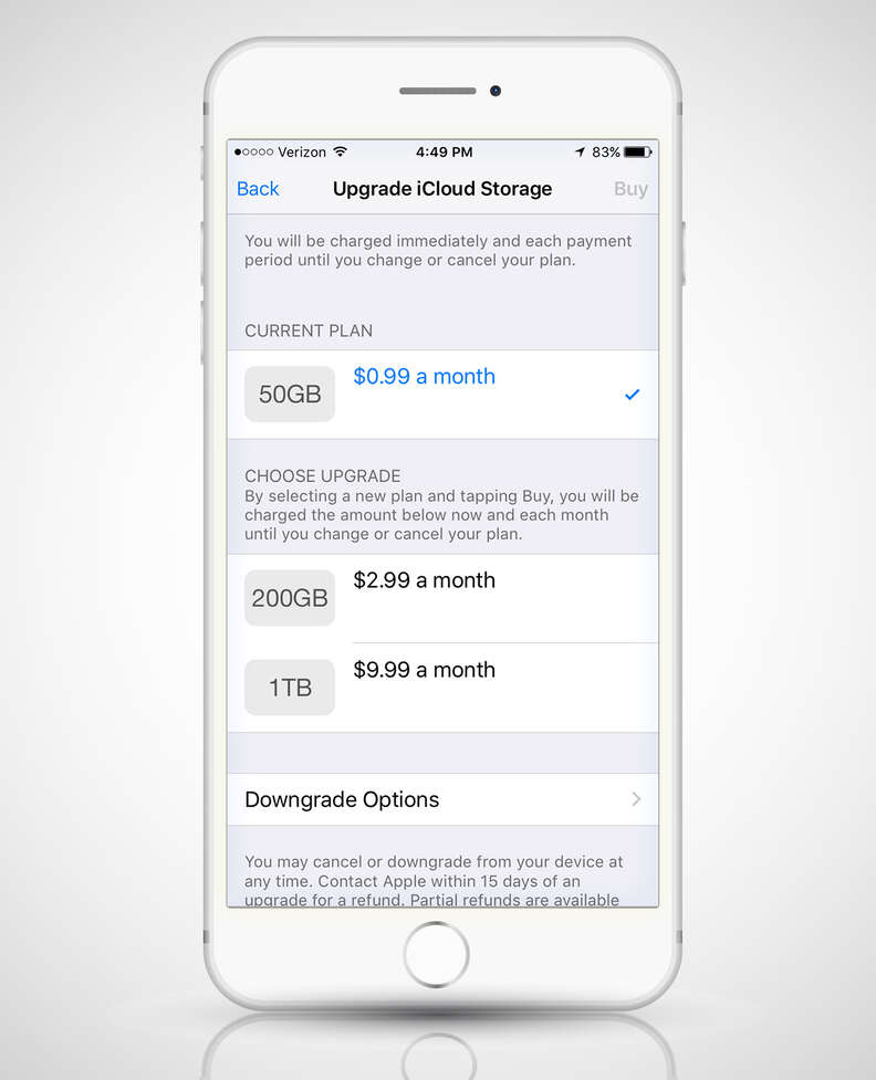 Of course, the easiest way to get rid of that godawful notification? Just give up and give Apple $.99 a month for access to 10 times more storage. To upgrade to that sweet, sweet 50GB, head to Settings > iCloud > Storage > and tap Change Storage Plan.